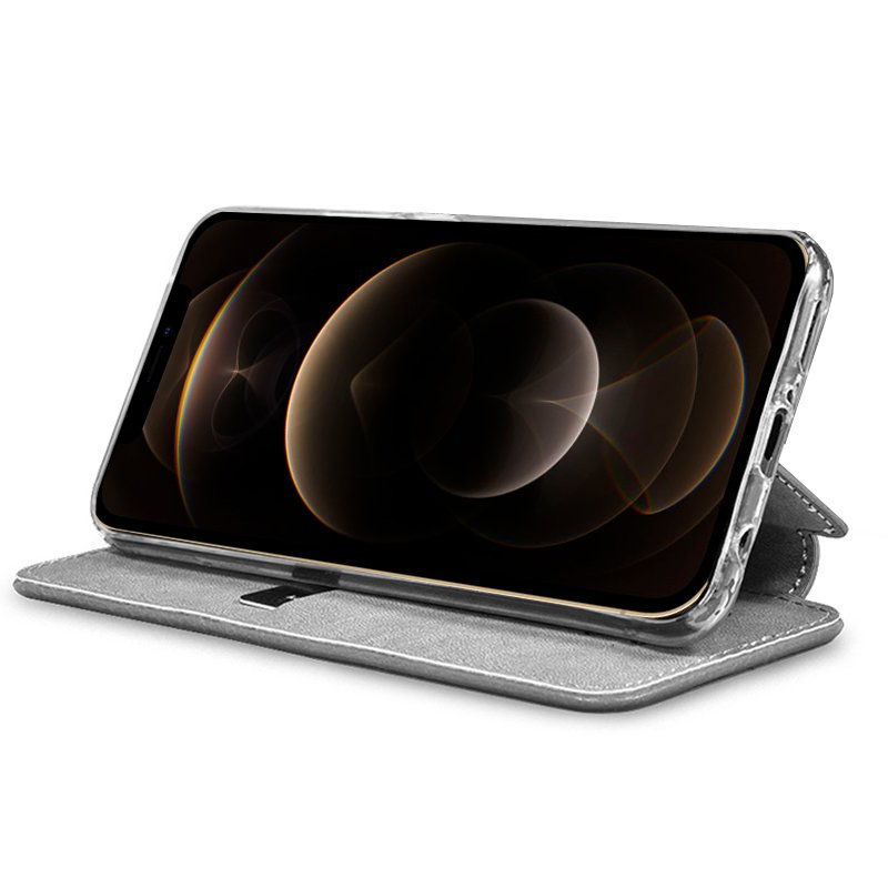 Apertura lateral tipo libro. Incorpora una carcasa específica del modelo de smartphone, para incrustarlo y dejarlo perfectamente encajado.