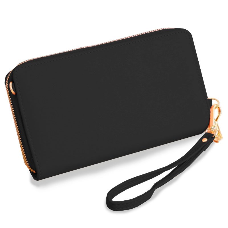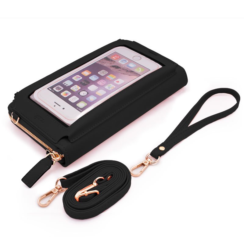 En su interior cuenta con separadores, porta tarjetas, un bolsillo con cierre de cremallera para guardar monedas u objetos pequeños, y en la parte delantera tiene un separador transparente para visualizar la pantalla de tu smartphone o colocar fotografías o el carnet de identidad.