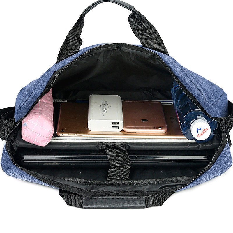 Inclui um bolso central com fecho, bolsos interiores e compartimentos.